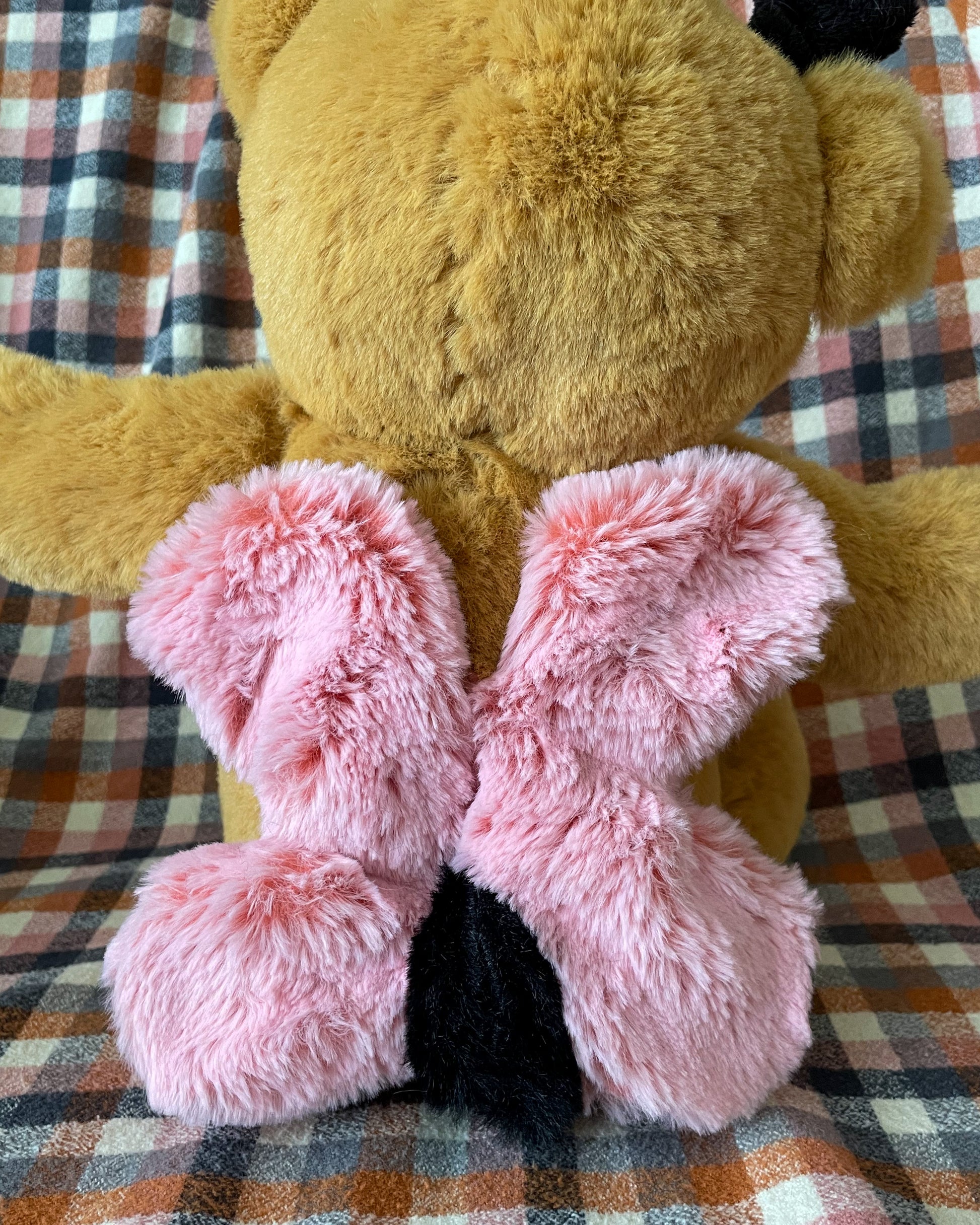 Marigold is designed to be a sensory delight. She weighted with plastic pellets in her hands, feet, and bottom, and stuffed with the fluffiest stuffing. She is made with the softest fabric in multiple textures. Her face is machine embroidered and her muzzle is hand-sculpted.