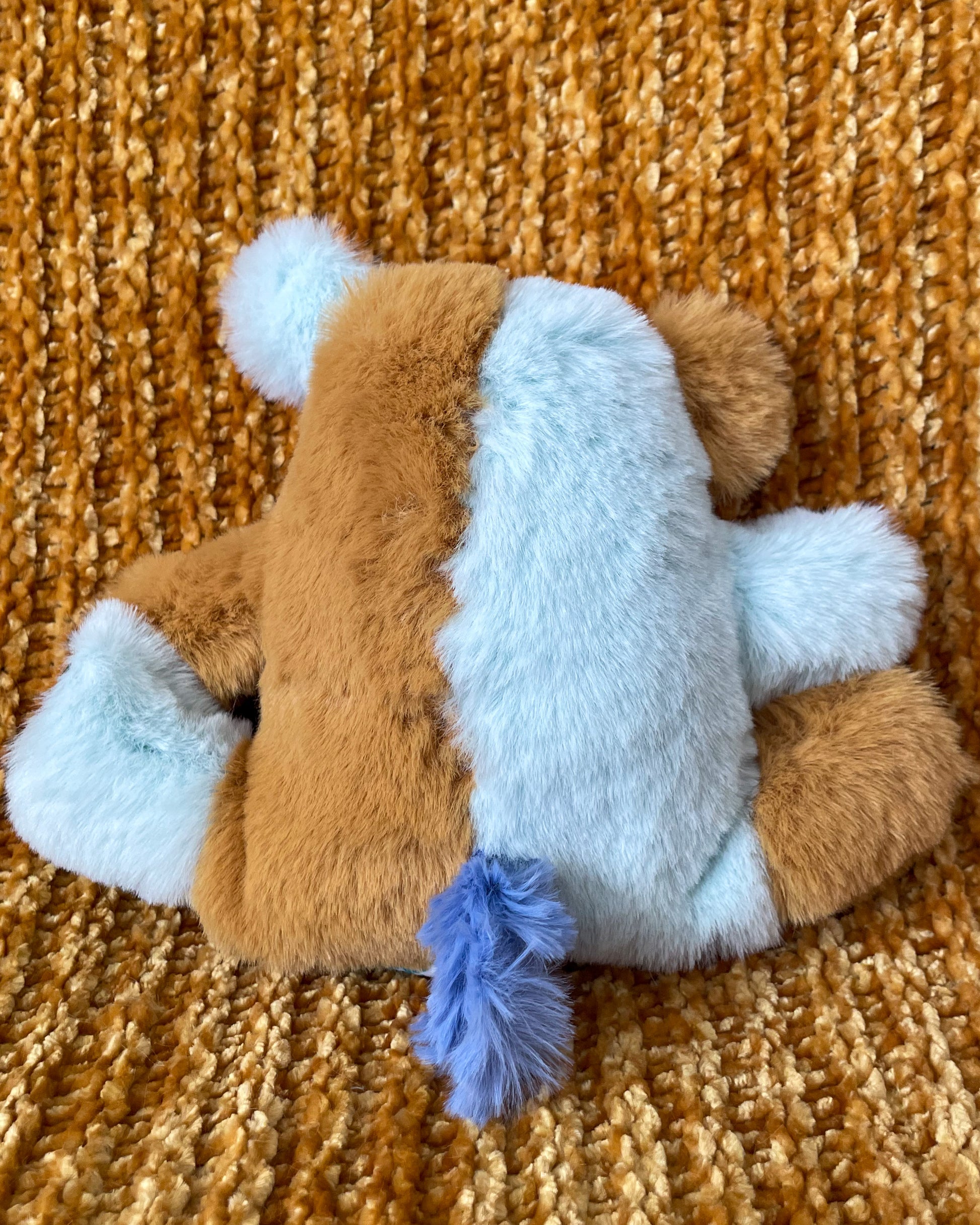 This bear is made from high-quality minky and cotton fabrics. She has rose quartz, gold, ice blue, and cornflower blue fur, a gold and pink hand-embroidered face, and floral print cotton accents on her feet and ears. Her multiple colors and textures make her a sensory delight. Stuffed with the softest stuffing for squishy hugs.